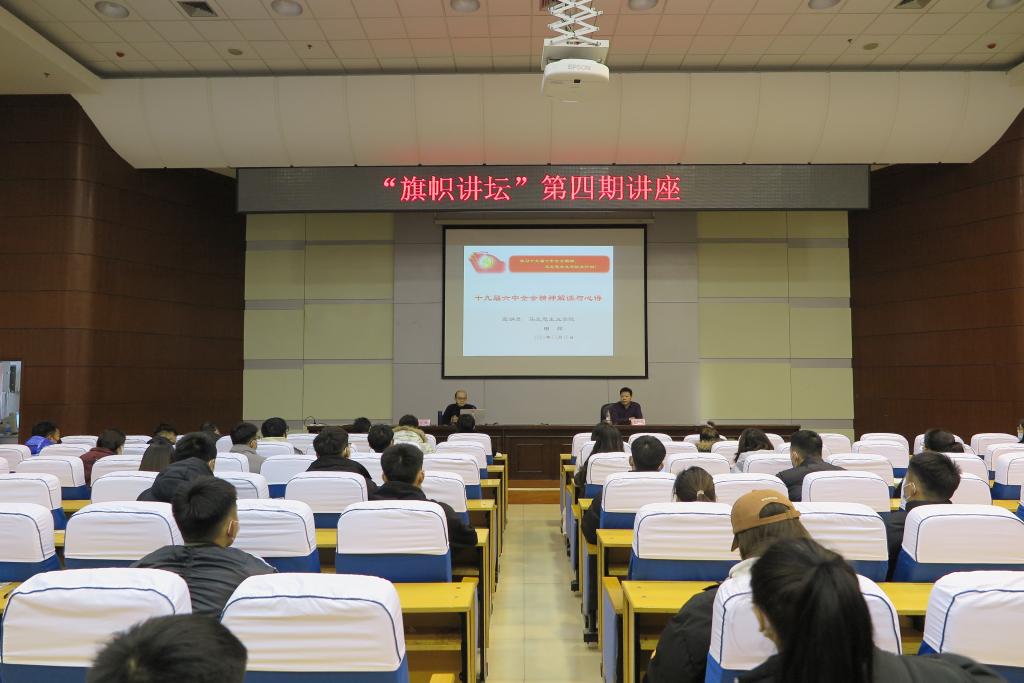 2021年12月16日下午,PP电子游戏官网“旗帜讲坛”第四期讲座在秦皇岛校区学术交流中心举办,专题宣讲十九届六中全会精神。PP电子游戏网站全体教师、体育与健康学院师生党员及学生入党积极分子等共100余人听取了讲座。